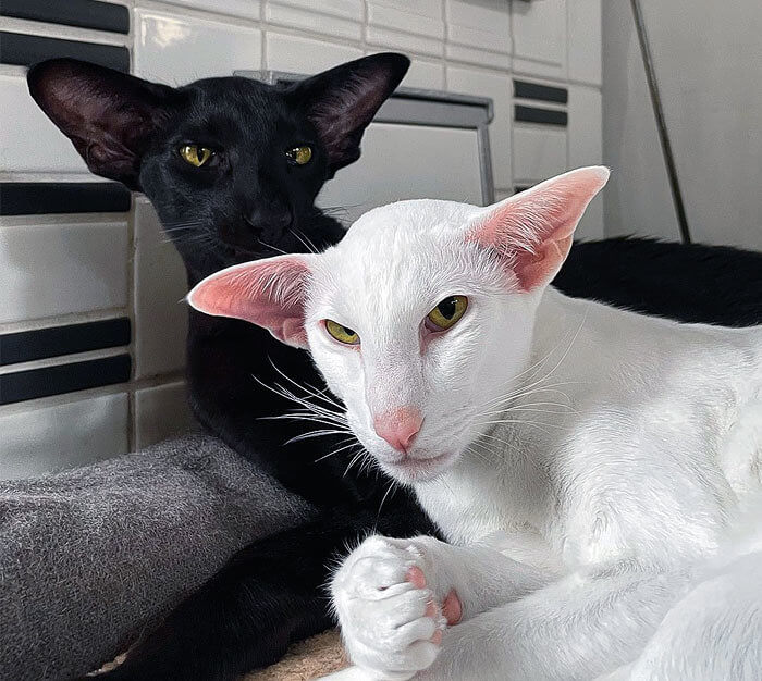 Many of the adorable big-eared animals on this list don’t seem to mind having their photos taken, but the pets in this house clearly have their own opinions. The black cat appears unfazed by his mom drawing attention to his oversized ears, lounging calmly as if he’s used to the spotlight. On the other hand, the white cat is anything but cooperative